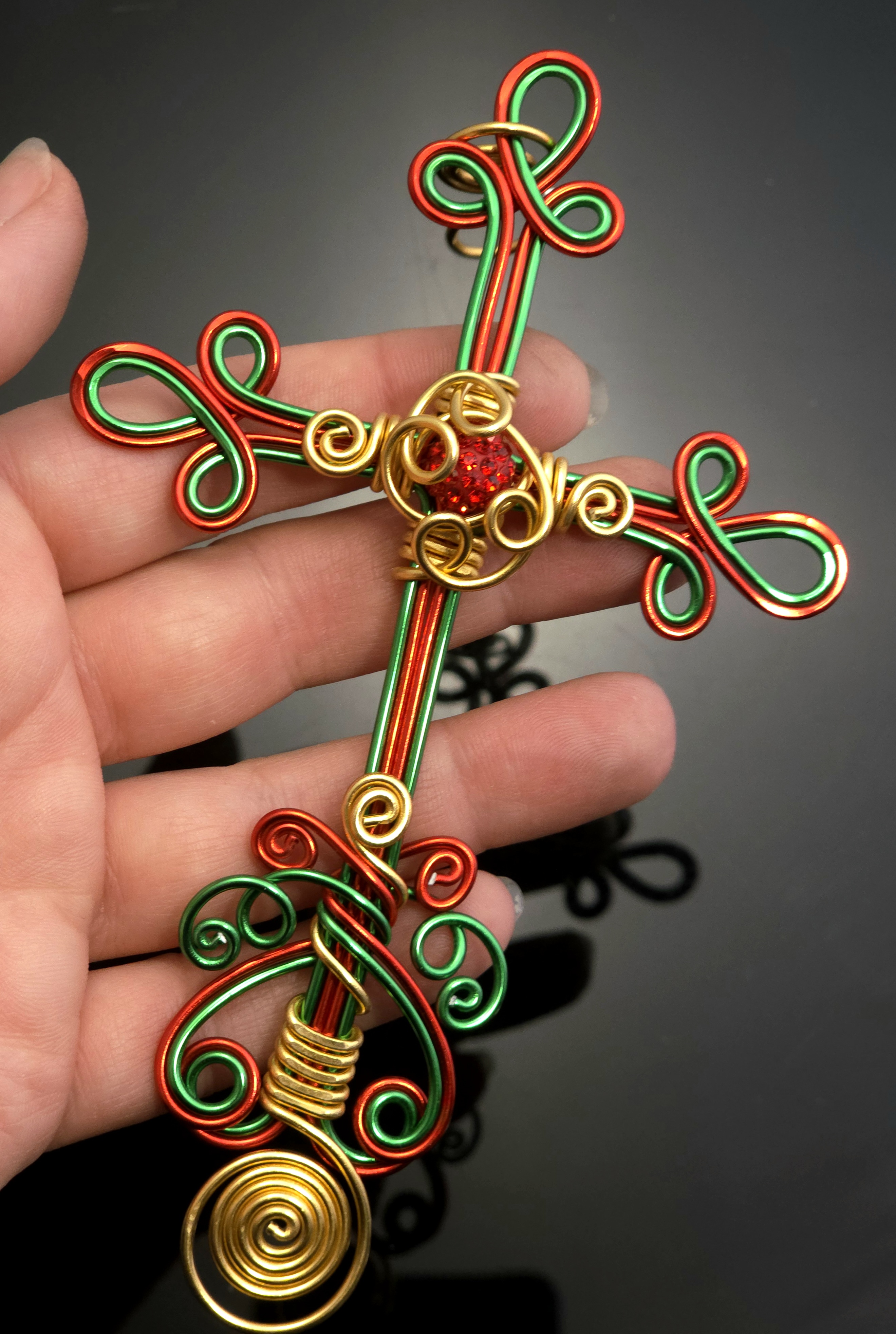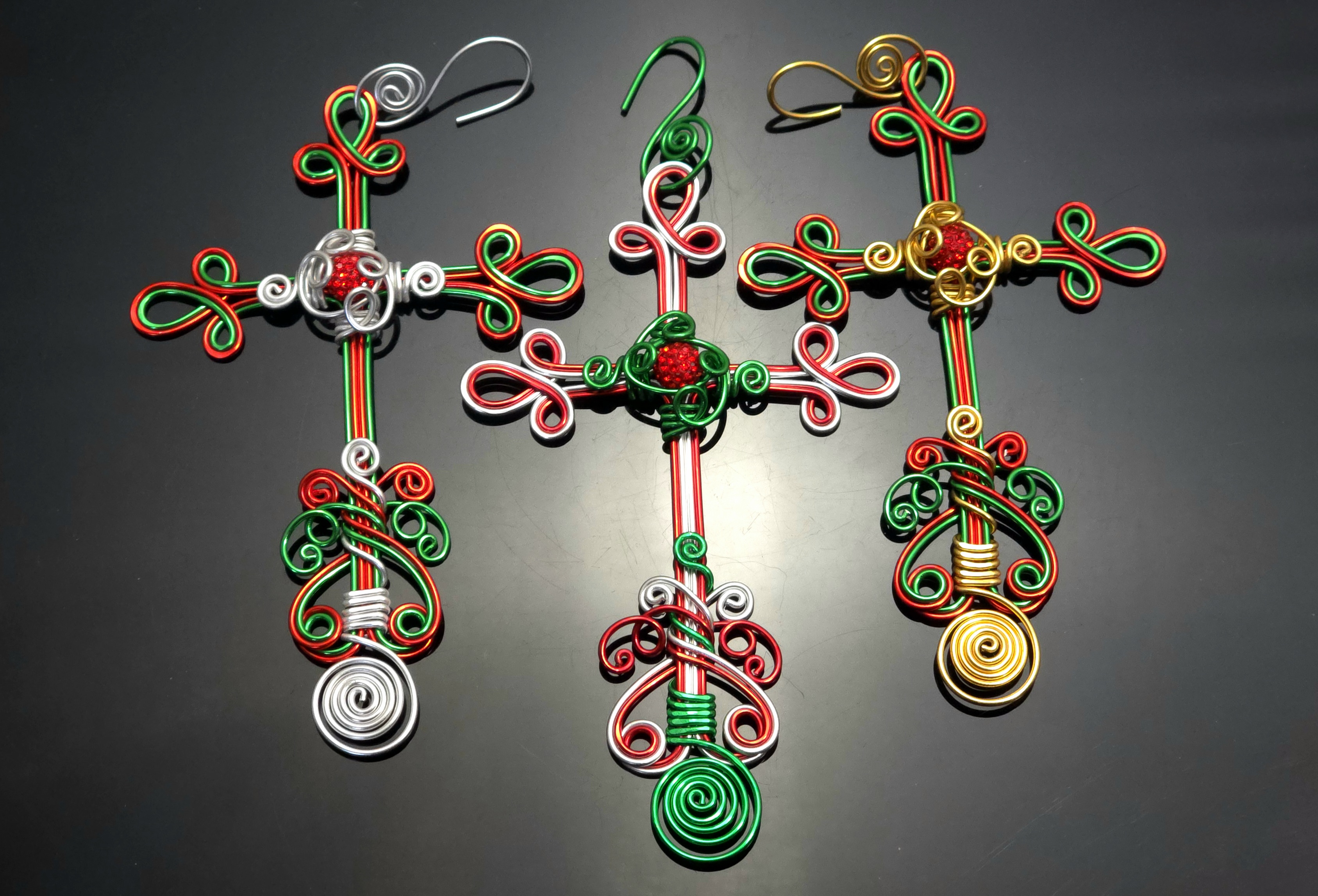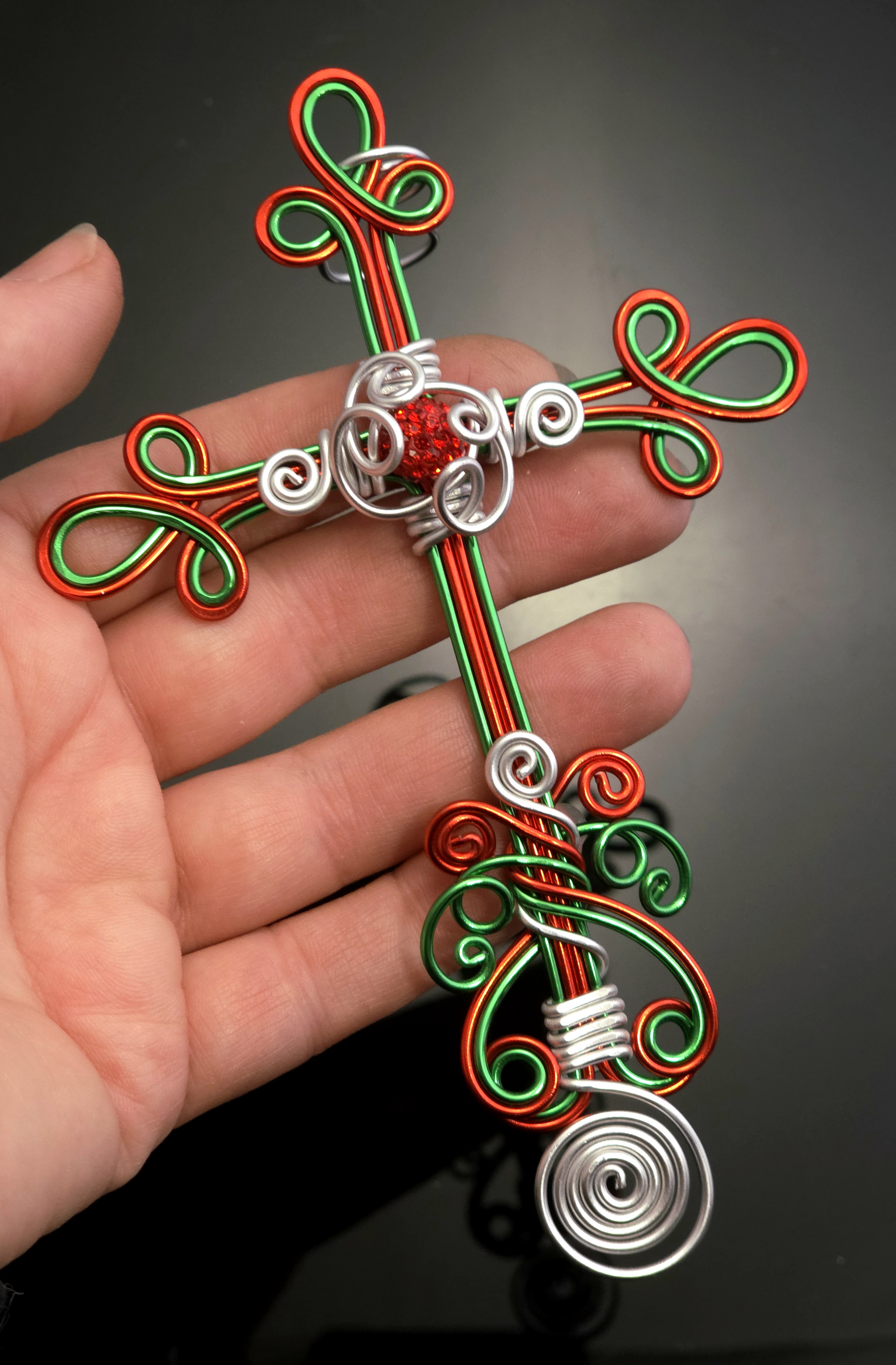I personaly design and handmake each of these ornate crosses myself. I hand wire wrap them using 14 gauge light weight non tarnishing anodized aluminum wires in different Christmas colors. These make a great christmas gift. It Can be hung anywhere; christmas tree, car, work desk or even a ceiling fan. Anodized aluminum is super light weight making it perfect for a christmas ornament. It Will not drag down your tree.