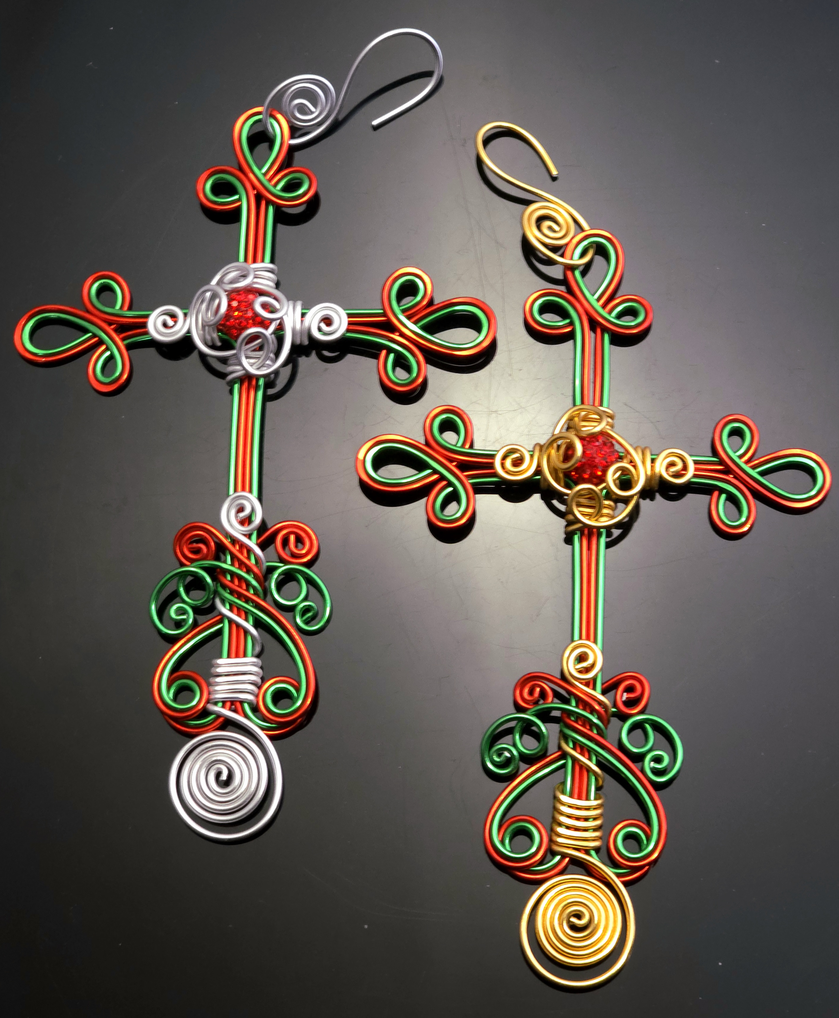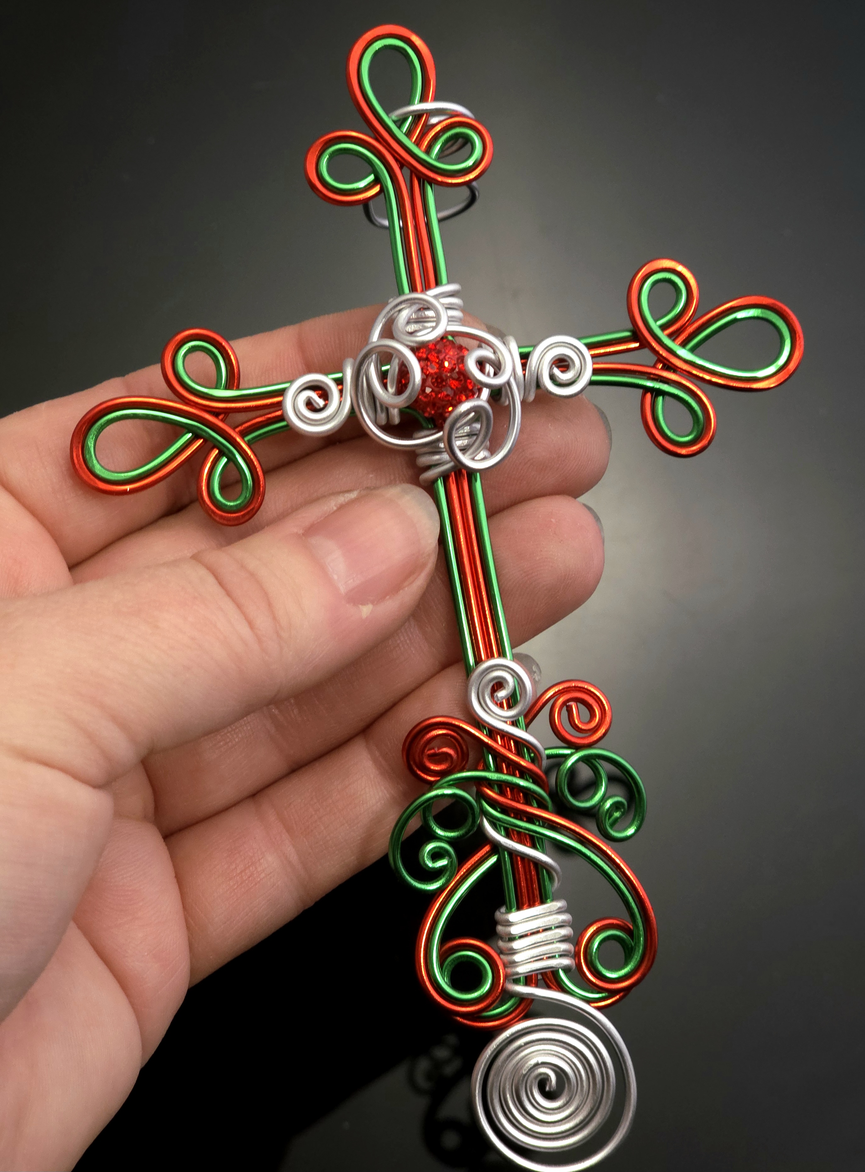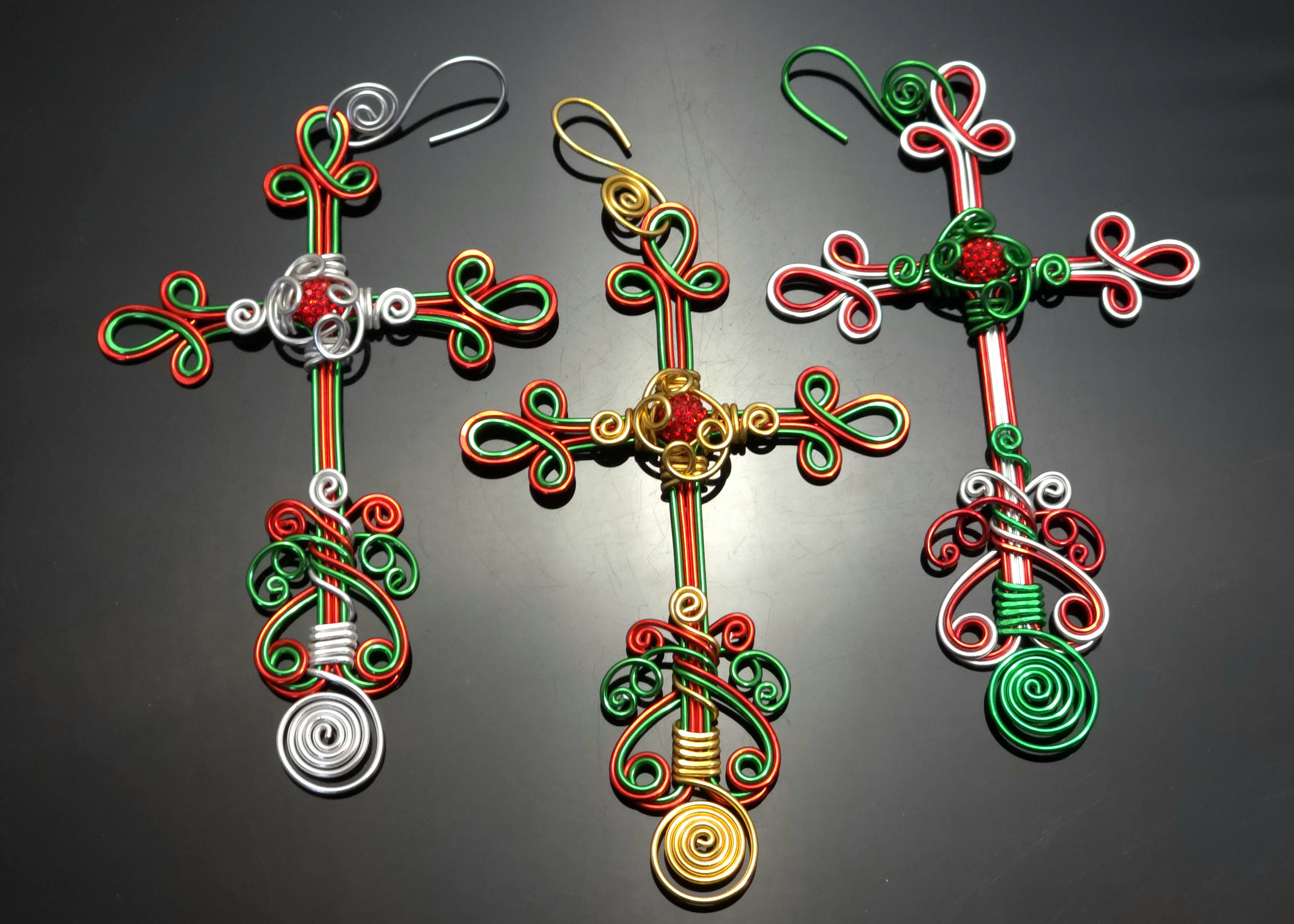 I personaly design and handmake each of these ornate crosses myself. I hand wire wrap them using 14 gauge light weight non tarnishing anodized aluminum wires in different Christmas colors. These make a great christmas gift. It Can be hung anywhere; christmas tree, car, work desk or even a ceiling fan. Anodized aluminum is super light weight making it perfect for a christmas ornament. It Will not drag down your tree.